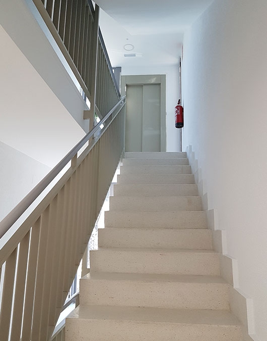 Para conseguir un itinerario adaptado se construye una nueva escalera interior de un solo tramo continuo y uniforme que comunica los diferentes niveles de planta permitiendo el embarque a la misma cota de las viviendas.